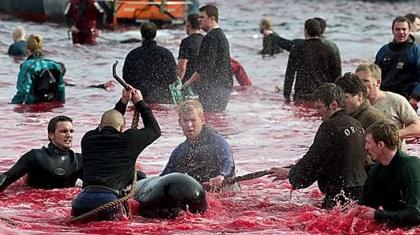 Όμως 17 περιοχές των Νησιών Φαρόε διατηρούν ακόμη το νόμιμο δικαίωμα να σκοτώνουν. Και είναι μια γιορτή στην οποία παίρνουν μέρος όλοι. Τα παιδιά μπορούν να μην πάνε στο σχολείο και να παρακολουθήσουν τη σφαγή. Για τους νεαρούς η συμμετοχή είναι ένας τρόπος για να δείξουν ότι έγιναν πια άντρες. Με τη χρήση γάντζων, σκοινιών και λεπίδων τα ζώα σφαγιάζονται, με τους επιστήμονες να συμφωνούν ότι ο θάνατος τους είναι αργός και βασανιστικός, μέσα στο άγχος. Όταν το αιματοκύλισμα τελειώσει, η κάθε οικογένεια παίρνει το μερίδιό της ως λάφυρο και η ζωή συνεχίζεται... Το μόνο που μένει για να θυμίζει το τι προηγήθηκε είναι το κόκκινο χρώμα με το οποίο βάφεται η θάλασσα από το αίμα αυτών των πλασμάτων...