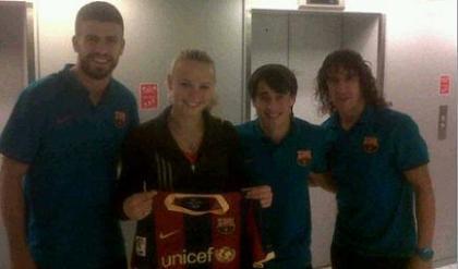 Μία ευχάριστη έκπληξη περίμενε τους παίκτες της Μπαρτσελόνα στο ξενοδοχείο που έχει καταλύσει η αποστολή για την αναμέτρηση με την Κοπεγχάγη για το Champions League. Η Καρολίνε Βοσνιάκι, κορυφαία τενίστρια σύμφωνα με την παγκόσμια κατάταξη, επισκέφτηκε τους Καταλανούς και οι Κάρλες Πουγιόλ, Ζεράρ Πικέ και Μπόγιαν Κρκιτς τής χάρισαν μία φανέλα της ομάδας.