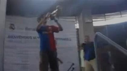 Εντάξει, η Μπαρτσελόνα έχει πάρει τον αέρα της Ρεάλ Μαδρίτης τελευταία. Αλλά από εκεί, μέχρι να ηχεί οι ύμνος της μέσα στο «Σαντιάγκο Μπερναμπέου», υπάρχει μεγάλη απόσταση. Ένας «τρελός» φίλος των Καταλανών μπήκε σαν κύριος στο παλάτι της «βασίλισσας» και αφού έβγαλε το μπουφάν του για να αποκαλύψει τη φανέλα της «Μπάρτσα» που φορούσε από μέσα, άρχισε να… σαλπίζει τον ύμνο της αγαπημένης του ομάδας μέσα στο άντρο του εχθρού.