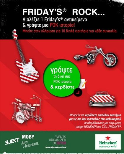 Τα T.G.I. Friday’s stories είναι στον “αέρα” με την υπογραφή της {Linakis+Associates}. Κέρδισε διπλά εισιτήρια για τις πιο ροκ συναυλίες του καλοκαιριού. Απόλαυσε από κοντά τους αγαπημένους σου καλλιτέχνες. Amy Winehouse - Moby στο Ejekt Festival & τους Bon Jovi.