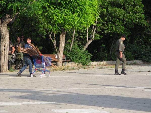Επίσης, ερωτήματα δημιουργεί φωτογραφία που δείχνει άντρα με πολιτικά να μεταφέρει σε καροτσάκι σούπερ μάρκετ ξύλα ρόπαλα και... πολεμικό υλικό, δίπλα από άνδρες των ΜΑΤ.