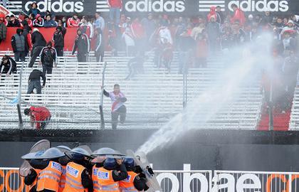 Συγκρούσεις μεταξύ εξαγριωμένων οπαδών και των ματ εντός και εκτός αγωνιστικού χώρου και επιθέσεις στους ποδοσφαιριστές της Ρίβερ Πλέιτ συνέθεταν ένα σκηνικό... αποκάλυψης στο «Μονουμεντάλ». Χρειάστηκε έξι ασθενοφόρα να εισέλθουν στο χώρο του γηπέδου για να προσφέρουν τις πρώτες βοήθειες σε τραυματίες και να μεταφέρουν τελικά περισσότερους από 25 στα νοσοκομεία του Μπουένος Άιρες.