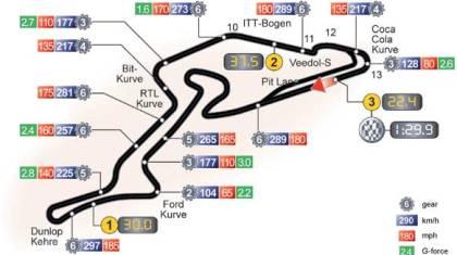 Οι πιλότοι θα στρίψουν 14 φορές, τη μέγιστη ταχύτητα αποκτούν λίγο πριν την έβδομη στροφή, όπου αγγίζουν τα 284 χιλιόμετρα την ώρα με έβδομη στο κιβώτιο ταχυτήτων.