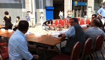 Εργαζόμενοι στα συνδικάτα Επισιτισμού - Τουρισμού & Ξενοδοχείων Αθηνών και Πειραιά συγκεντρώθηκαν έξω από το υπουργείο Οικονομικών και έστησαν καρέκλες και έδρανα προκειμένου να πραγματοποιήσουν συνέντευξη τύπου, ώστε να κοινοποιήσουν τα προβλήματα τους.