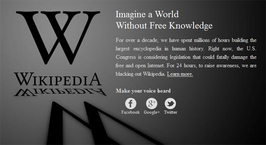 «Για πάνω από μία δεκαετία έχουμε ξοδέψει εκατομμύρια ώρες χτίζοντας την μεγαλύτερη εγκυκλοπαίδεια στην ανθρώπινη ιστορία. Αυτή τη στιγμή το αμερικανικό κογκρέσο εξετάζει μία νομοθεσία που μπορεί να πλήξει θανάσιμα το ελεύθερο και ανοιχτό σε όλους internet. Για 24 ώρες και με σκοπό να μάθει ο κόσμος τι συμβαίνει, κάνουμε black out στη Wikipedia».