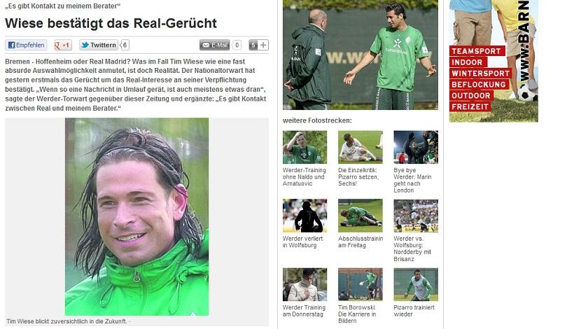 Στην αποκάλυψη ότι η Ρεάλ Μαδρίτης ενδιαφέρεται για την απόκτησή του προέβη ο Τιμ Βίζε, μιλώντας στην «Kreiszeitung». Επίσης, ο 31χρονος τερματοφύλακας τόνισε ότι υπήρξε επαφή ανάμεσα στην ομάδα του, Βέρντερ Βρέμης, με τους Μαδριλένους και τον μάνατζέρ του.