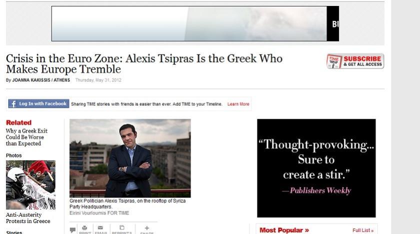 «Πριν μερικές εβδομάδες ο 37χρονος Αλέξης Τσίπρας ήταν ένας μικρός πολιτικός της αντιπολίτευσης. Σήμερα διαταράσσει την Ευρωπαϊκή Ένωση καθώς το αριστερό κόμμα του ΣΥΡΙΖΑ – κόμμα που περιέχει από μετριοπαθείς σοσιαλιστές μέχρι σκληρούς κομμουνιστές – ενδέχεται να κληθεί να σχηματίσει κυβέρνηση μετά τις εκλογές της 17ης Ιουνίου», γράφει το περιοδικό TIME αναφερόμενο στον πρόεδρο του ΣΥΡΙΖΑ, παραθέτοντας μία σύνεντευξη του αρχηγού του ΣΥΡΙΖΑ.