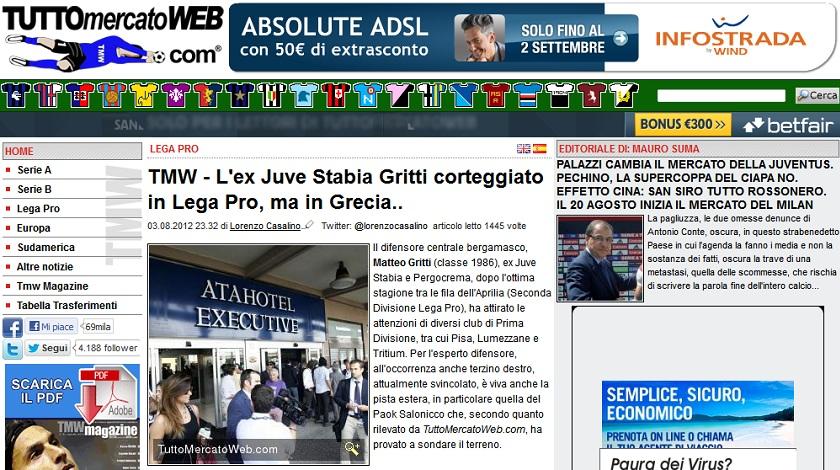 Το ενδιαφέρον του ΠΑΟΚ έχει προσελκύσει ο Ματέο Γκρίτι, σύμφωνα με δημοσιεύματα του ιταλικού Τύπου.