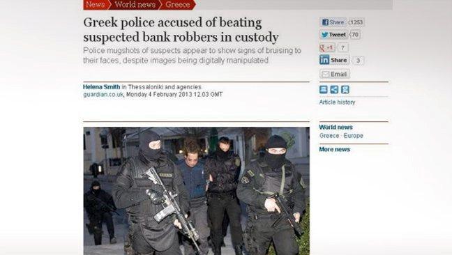Όπως αναφέρει το δημοσίευμα, η ελληνικές αρχές βρίσκονται υπό πίεση για να εξηγήσουν τις φωτογραφίες της αστυνομίας των τεσσάρων υπόπτων ως ληστών τραπεζών, από τους οποίους οι τρεις είναι επίσης ύποπτοι ως μέλη εγχώριας τρομοκρατικής οργάνωσης, που εμφανίζονται να έχουν χτυπηθεί βάναυσα κατά την κράτησή τους.