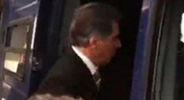 Κατά την είσοδό του στο όχημα της ΕΛΑΣ, ο κ. Παπαγεωργόπουλος μοιάζει να κρύβει τις χειροπέδες κάτω από το καφέ παλτό του.