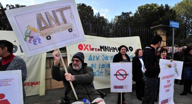 Οι διαδηλωτές κρατούν πανό με συνθήματα κατά του μνημονίου και της απόφασης για αναδιάρθρωση της Λαϊκής Τράπεζας και φωνάζουν συνθήματα και εναντίον του Διοικητή της ΚΤ, όπως «Δημητριάδη παραιτήσου, εσύ και οι σύμβουλοί σου».