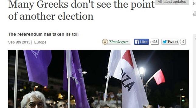 Στις 20 Σεπτεμβρίου η Ελλάδα οδηγείται στις κάλπες για τρίτη φορά σε ένα χρόνο και πολλοί Έλληνες δεν καταλαβαίνουν γιατί, παρατηρεί σε δημοσίευμά του ο Economist, τονίζοντας πως αρκετοί δεν βλέπουν το νόημα μιας της νέας αυτής εκλογικής αναμέτρησης.