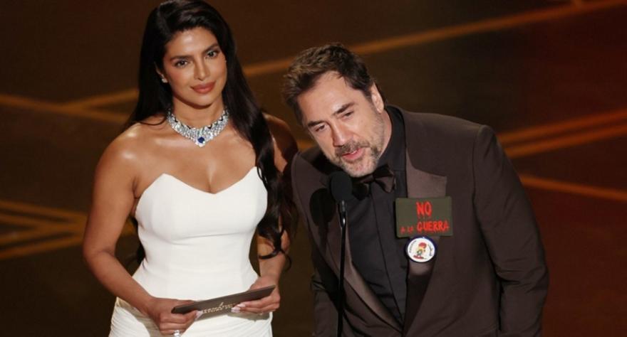 Όταν έφτασε η στιγμή να παρουσιάσει το βραβείο για την Καλύτερη Διεθνή Ταινία, ο 57χρονος ηθοποιός εμφανίστηκε φορώντας μια καρφίτσα με την φράση «No a la guerra» στα ισπανικά που σημαίνει «όχι στον πόλεμο». Στη συνέχεια φώναξε από σκηνής «όχι στον πόλεμο-Ελευθερία στην Παλαιστίνη» με το κοινό να τον χειροκροτά.