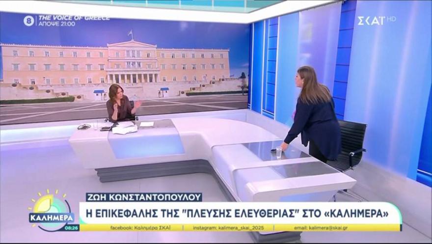 Καλεσμένη στην εκπομπή του ΣΚΑΪ «Καλημέρα» ήταν το πρωί του Σαββάτου η πρόεδρος της Πλεύσης Ελευθερίας, Ζωή Κωνσταντοπούλου, η οποία ωστόσο αποχώρησε στην πρώτη ερώτηση.