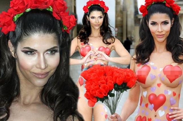 Το εκκεντρικό μοντέλο ζωγράφισε το ολόγυμνο κορμί της με καρδούλες διαφόρων μεγεθών, φόρεσε ένα στεφάνι από τριαντάφυλλα στα μαλλιά, κάλυψε το επίμαχο σημείο με ροδοπέταλα και σκόρπισε τον έρωτα γύρω της..