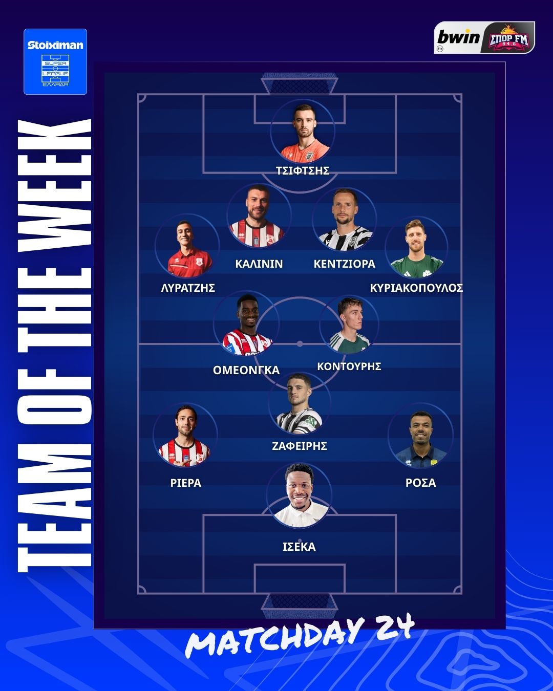 Αναλυτικά η ενδεκάδα της αγωνιστικής: Τσιφτσής- Λύρατζης, Κεντζιόρα, Κάλινιν, Κυριακόπουλος – Ομεονγκά, Κοντούρης, Ζαφείρης – Ρόσα, Ριέρα – Ισέκα