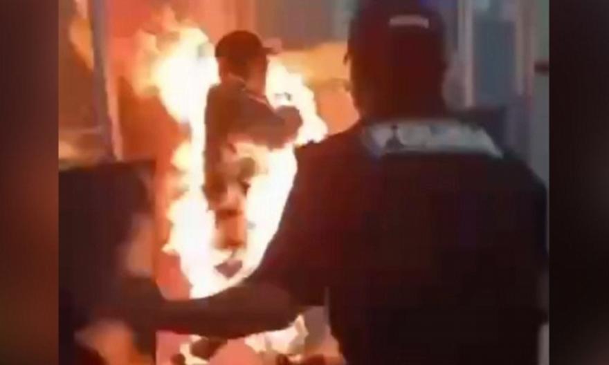 Βίντεο που διέρρευσε στα μέσα κοινωνικής δικτύωσης δείχνει τον άνδρα να τυλίγεται στις φλόγες και να τρέχει προς την αίθουσα αναμονής πριν καταρρεύσει.