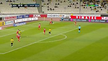 Το ματς είχε αποκτήσει εξαιρετικό ρυθμό, η μπάλα πήγαινε πάνω-κάτω και οι δύο ομάδες βρέθηκαν αγκαλιά με το προβάδισμα σε ένα εκρηκτικό τρίλεπτο. Αρχικά, στο 34’ οι «κιτρινόμαυροι» συνεργάστηκαν άψογα, με τον Τάνκοβιτς να βρίσκει τον Σιμάνσκι στην περιοχή και αυτός να κάνει το γύρισμα στον Αραούχο, ο οποίος έκανε μια… πίβοτ αλλά το πλασέ του από πλεονεκτική θέση δεν βρήκε εστία! Δύο λεπτά μετά η Βελέζ ήταν αυτή που άγγιξε το γκολ, αλλά ο Στάνκοβιτς με μεγάλη επέμβαση δεν επέτρεψε στον Ράντοβατς να σκοράρει, ενώ το σουτ του Ζάιμοβιτς στη συνέχεια από πολύ κοντά βρήκε στα σώματα και πέρασε κόρνερ. Από την εκτέλεση αυτού, η ΑΕΚ έφυγε ταχύτατα στην κόντρα-επίθεση ο Τάνκοβιτς έσπασε για τον Αραούχο ο οποίος από τα όρια της περιοχής έπιασε φοβερό σουτ στην κίνηση αλλά ο Μπογκντάνοβιτς με μεγάλη επέμβαση κράτησε το μηδέν.