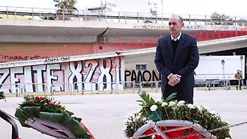 Ο αρχηγός των «ερυθρόλευκων», Γιώργος Πρίντεζης, κατέθεσε στεφάνι, ενώ τα υπόλοιπα μέλη της ομάδας άφησαν από ένα κόκκινο τριαντάφυλλο.
