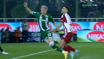 Καλή στιγμή για τον Ολυμπιακό στο 24ο λεπτό του ντέρμπι με τον Παναθηναϊκό, με τον Μπακαμπού να στρώνει στον Χάμες Ροντρίγκες και τον Κολομβιανό να σουτάρει αλλά να βλέπει τον Μπρινιόλι να σταματά την μπάλα με το σώμα.