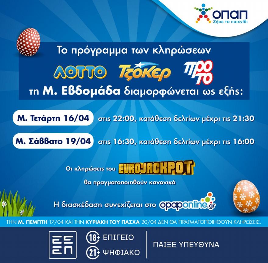 Οι κληρώσεις της Κυριακής του Πάσχα στο ΤΖΟΚΕΡ και το ΠΡΟΤΟ θα διεξαχθούν το Μεγάλο Σάββατο, στις 16:30. Την ίδια ώρα θα πραγματοποιηθεί και η κλήρωση του ΛΟΤΤΟ. Οι παίκτες μπορούν να καταθέτουν τα δελτία τους μέχρι τις 16:00, το Μεγάλο Σάββατο.