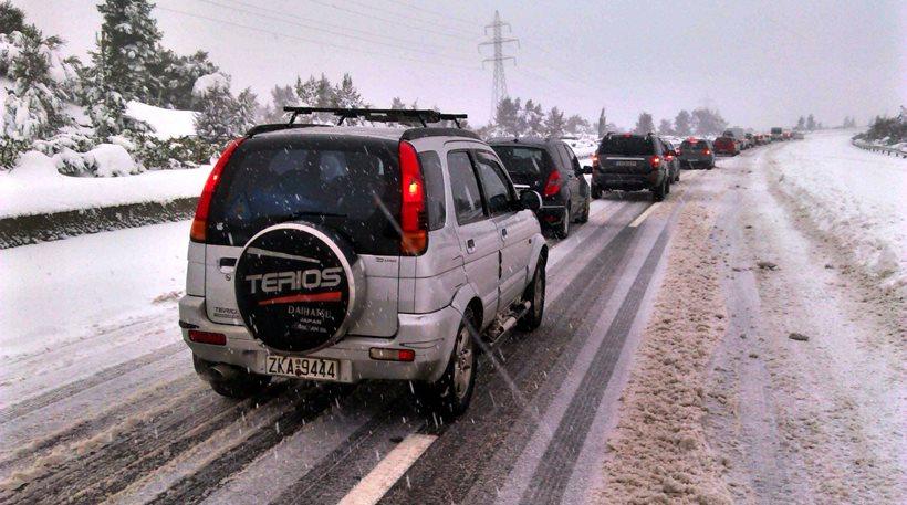Εν τω μεταξύ, απαγορεύτηκε η κίνηση των φορτηγών στην εθνική οδό, καθώς συνεχίζεται η πυκνή χιονόπτωση, στο μεγαλύτερο τμήμα του δρόμου.