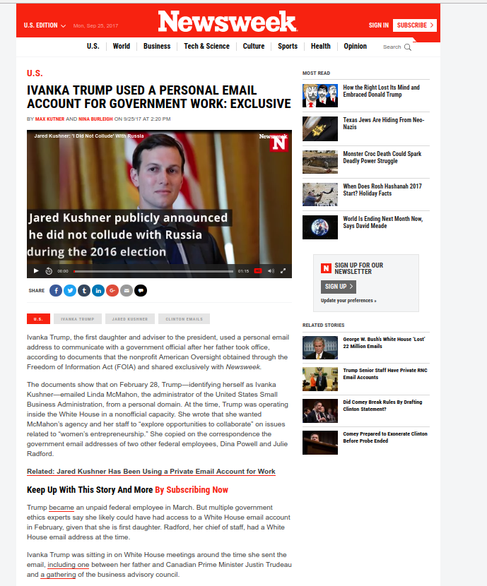 Η Ιβάνκα Τραμπ ανέλαβε επίσημο άμισθο ρόλο τον Μάρτιο. «Αλλά δεκάδες ειδικοί σε θέματα κυβερνητικής ηθικής λένε ότι πιθανότατα είχε πρόσβαση σε λογαριασμό email του Λευκού Οίκου τον Φεβρουάριο, δεδομένου ότι είναι η Πρώτη Κόρη. Ο Ράντφορντ, ο επικεφαλής του επιτελείου της είχε επίσημο email του Λευκού Οίκου εκείνη την περίοδο. Η Ιβάνκα Τραμπ συμμετείχε σε συναντήσεις του Λευκού Οίκου την περίοδο που έστειλε το email, όπως για παράδειγμα στην συνάντηση του Καναδού πρωθυπουργού Τζάστιν Τριντό...».