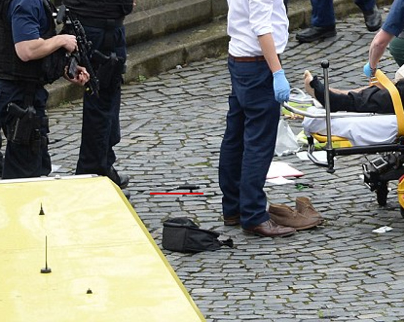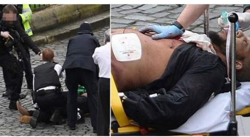 Βρίσκεται τραυματίας στον περιβάλλοντα χώρο του βρετανικού Κοινοβουλίου και οι τραυματιοφορείς αφού του έχουν δώσει τις πρώτες βοήθειες τον μεταφέρουν στο ασθενοφόρο.