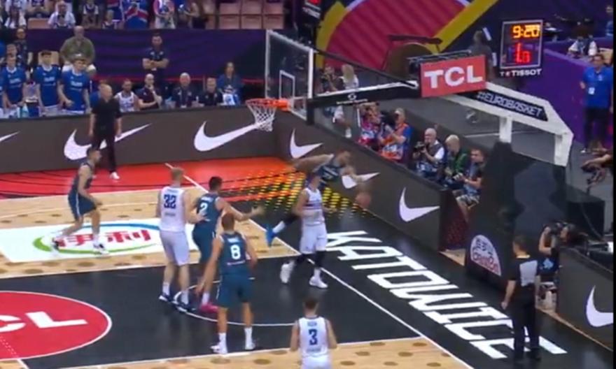 Ο σούπερ σταρ των Σλοβένων, Λούκα Ντόντσιτς, πρωταγωνίστησε σε μια τρομερή αμυντική ενέργεια, καθώς μετά από μπλοκ που έκανε πάνω στον αντίπαλό του, βγήκε εκτός παρκέ και έστειλε την μπάλα πάνω στον παίκτη των Ισλανδών κερδίζοντας την κατοχή!