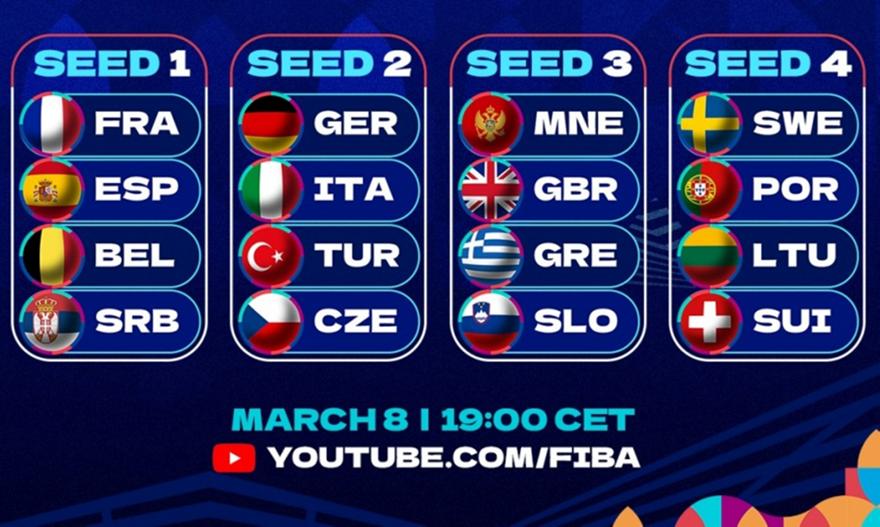 Στο πρώτο γκρουπ βρίσκονται η Γαλλία, η Ισπανία, το Βέλγιο κι η Σερβία, στο δεύτερο η Γερμανία, η Ιταλία, η Τουρκία κι η Τσεχία, στο τρίτο, μαζί με την Εθνική, το Μαυροβούνιο, η Μεγάλη Βρετανία κι η Σλοβενία και στο τέταρτο η Σουηδία, η Πορτογαλία, η Λιθουανία κι η Ελβετία.