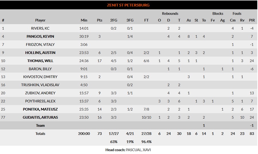 Κορυφαίοι για την ομάδα του Τσάβι Πασκουάλ οι Γκουντάιτις και Τόμας με 16 και 17 πόντους αντίστοιχα, ξεχώρισε από την Άλμπα που είχε 4/22 τρίποντα ο Λέιμερς με 13 πόντους και 10 ριμπάουντ. Στο 2-6 έπεσε το ρεκόρ της ομάδας του Αίτο Ρενέσες.