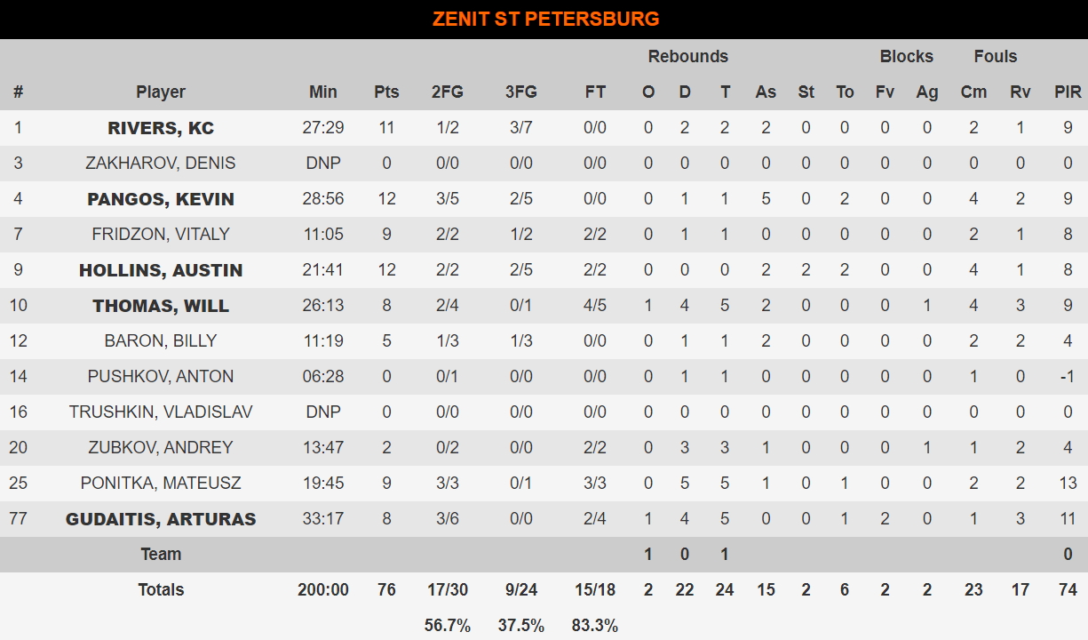 Από την άλλη, οι Ρώσοι υπέστησαν τη 2η διαδοχική ήττα τους και υποχώρησαν στο 13-8. Πάνγκος (12 πόντοι, 5 ασίστ) και Ρίβερς (11 πόντοι) διακρίθηκαν από το σύνολο του Πασκουάλ.