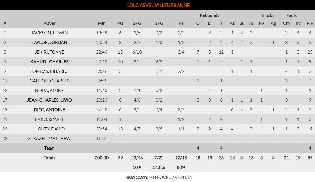 Βιλερμπάν (Μίτροβιτς): Τζάκσον 6, Τέιλορ 8, Τζεκίρι 15 (12 ριμπ.), Καουντί 10, Λόμας 5, Γκαλιού, Νουά 2, Ζαν-Σαρλ 8, Ντιό 6 (6 ασίστ), Μπακό 1, Λάιτι 18, Στρέιζελ