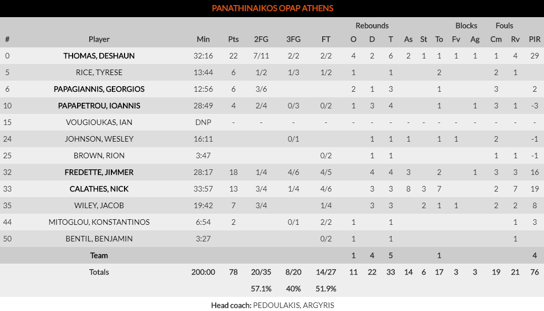 Παναθηναϊκός (Πεδουλάκης): Τόμας 22 (6 ριμπ.), Ράις 6, Παπαγιάννης 6, Παπαπέτρου 4, Βουγιούκας, Τζόνσον, Μπράουν, Φριντέτ 18, Καλάθης 13 (8 ασίστ), Γουάιλι 7, Μήτογλου 2, Μπέντιλ