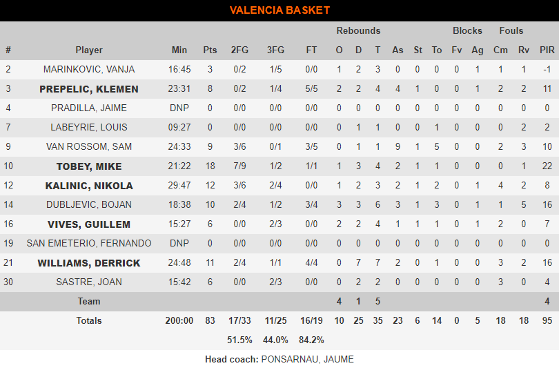 Μεγάλη εντός έδρας νίκη που την κάνει να βλέπει πρόκριση στα playoffs της Ευρωλίγκας, πέτυχε η Βαλένθια κόντρα στη Μπάγερν Μονάχου (83-76) για την 31η αγωνιστική.