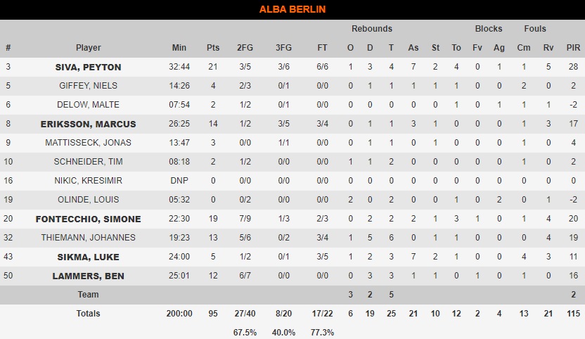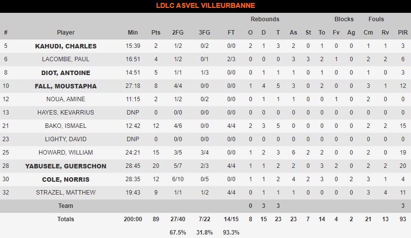 Κορυφαίος για τους νικητές ο Σίβα (21π., 7ασ., 4ρ.), τον ακολούθησαν Φοντέκιο (19π.), Έρικσον (14π.). Για τη Βιλερμπάν ξεχώρισαν Γιαμπουσέλε (18π.) και Χάουαρντ (15π., 6ασ.),