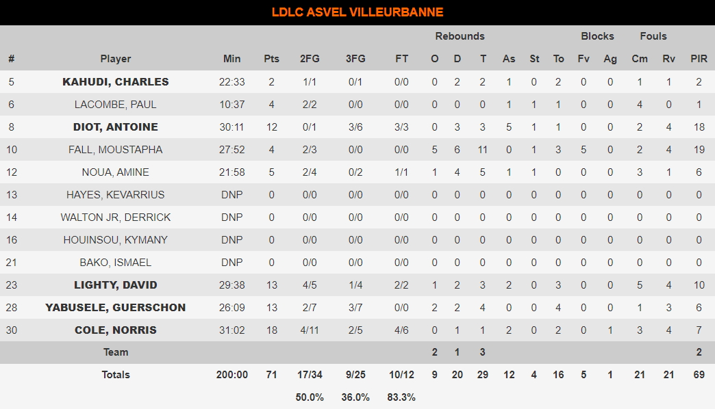 Κορυφαίοι για τους νικητές οι Αμπάλδε (11 πόντοι, 5 ριμπάουντ) και Τόμπκινς (13 πόντοι), ενώ από τους Γάλλους διακρίθηκαν οι Ντιό (12 πόντοι, 5 ασίστ), Λάιτι (13 πόντοι).