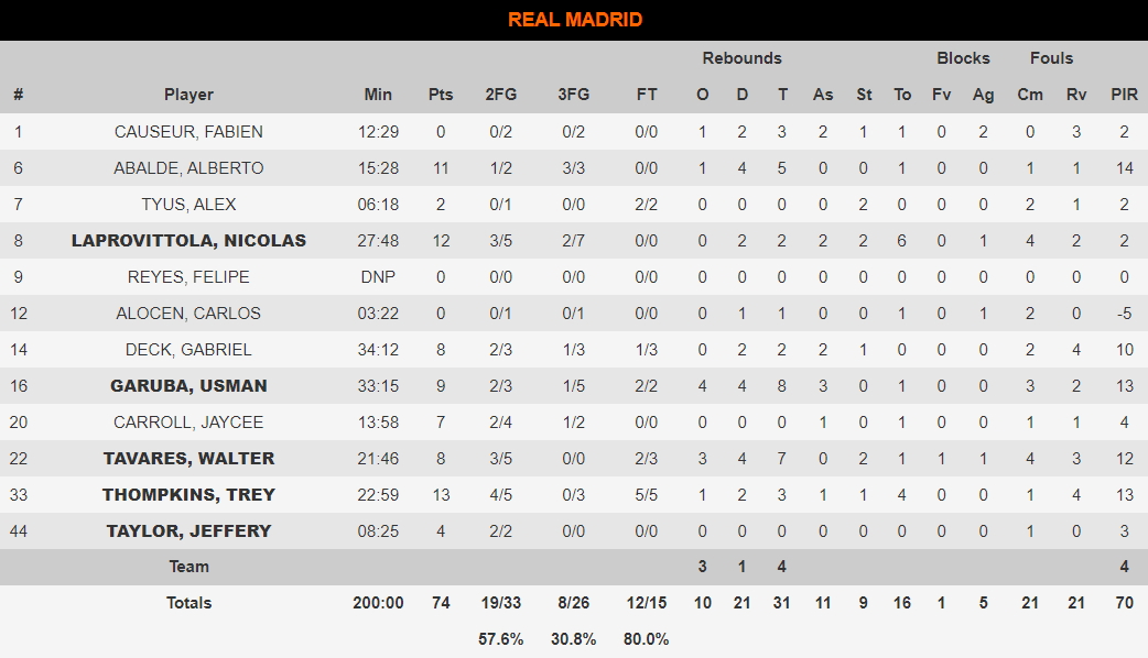 Με 2/2 του Τόμπκινς από τη γραμμή, η ομάδα της Μαδρίτης πήγε στο +3 (71-74) με 10 δεύτερα για τη λήξη. Κόουλ και Καουντί αστόχησαν έξω από τα 6,75μ. στην τελευταία επίθεση των Γάλλων και κάπως έτσι το ροζ φύλλο αγώνα μπήκε στην τσέπη των ανθρώπων της Ρεάλ.