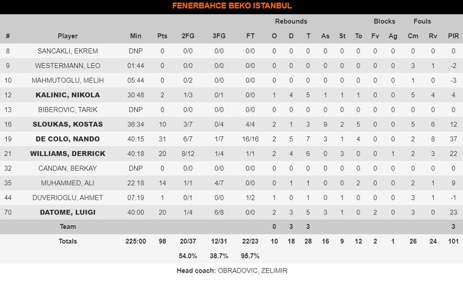 Φενέρμπαχτσε (Ζέλικο Ομπράντοβιτς): Βέστερμαν, Μαχμούτογλου, Κάλινιτς 2, Μπιμπέροβιτς, Σλούκας 10, Ντε Κολό 31, Γουίλιαμς 20, Ντίξον 14, Ντουβερίογλου 1, Ντατόμε 20.