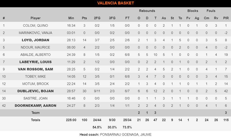 Βαλένθια (Χάουμε Πονσαρνάου): Κολόμ 3, Μαρίνκοβιτς, Λόιντ 14, Εντούρ 4, Αμπάλδε 8, Λαμπεϊρί 2, Βαν Ρόσομ 5, Τόμπεϊ 12, Μότουμ 14, Ντούμπλιεβιτς 30 (9/11 διπ., 2/3 τριπ., 6/7 βολές, 12 ριμπ.), Σάστρε, Ντόρνεκαμπ 8.