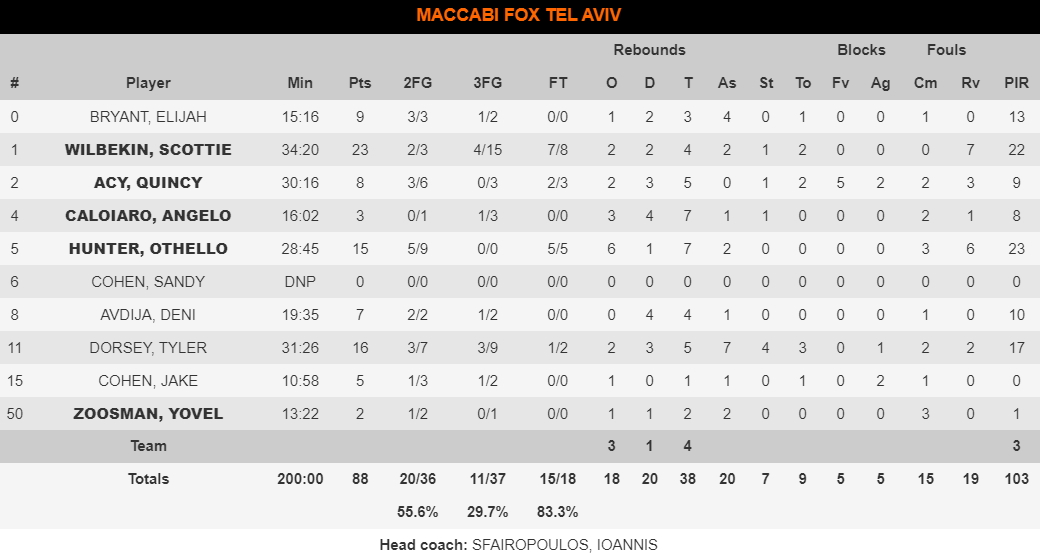 Μακάμπι Τελ Αβίβ (Σφαιρόπουλος): Μπράιαντ 9, Γουίλμπεκιν 23, Έισι 8, Καλοϊάρο 3 (7 ριμπ.), Χάντερ 15 (7 ριμπ.), Κοέν Σ., Αβντίγια 7, Ντόρσεϊ 16 (7 ασίστ, 5 ριμπ., 4 κλ.), Κοέν Τζ. 5, Ζούσμαν 2