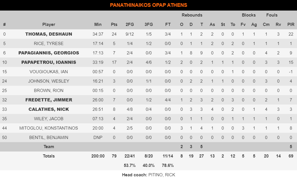 Παναθηναϊκός (Πιτίνο): Τόμας 24, Ράις 5, Παπαγιάννης 7 (9 ριμπ.), Παπαπέτρου 17, Βουγιούκας, Τζόνσον 3, Μπράουν, Φριντέτ 7, Καλάθης 8, Γουάιλι 4, Μήτογλου 4, Μπέντιλ