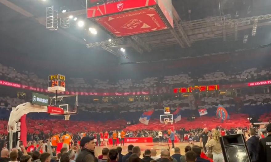 Λίγο πριν το τζάμπολ της αναμέτρησης, οι «ερυθρόλευκοι» του Βελιγραδίου σήκωσαν ένα κορεό που κάλυπτε το μεγαλύτερο μέρος της κάτω κερκίδας, κορεό το οποίο ήταν σχεδιασμένο στα χρώματα της ρωσικής σημαίας.
