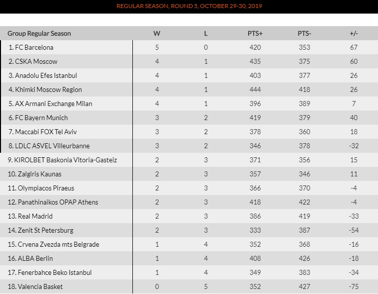 Η κατάταξη της Ευρωλίγκας μετά το τέλος της 5ης αγωνιστικής.