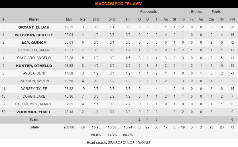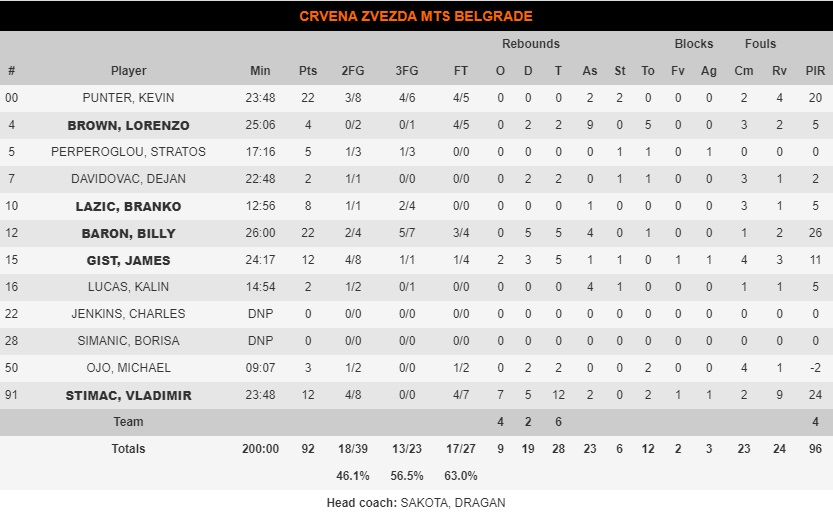 Πραγματοποιώντας μια από τις χειρότερες εμφανίσεις της στη φετινή Euroleague, η Μακάμπι Τελ Αβίβ γνώρισε βαριά ήττα με 92-76 από τον Ερυθρό Αστέρα στη Stark Arena», στο πλαίσιο της 28ης αγωνιστικής. Από την άλλη, οι Σέρβοι έκαναν… παπάδες, έχοντας κορυφαίους τους Πάντερ και Μπάρον, οι οποίοι είχαν από 22 πόντους. Πολύ χρήσιμη δουλειά έκανε ο Στίματς με 12 πόντους και 12 ριμπάουντ, ενώ διψήφιος ήταν και ο Γκίστ με 12 πόντους. Για τους ηττημένους, ο μοναδικός που διασώθηκε ήταν ο Ντόρσεϊ με 19 πόντους.