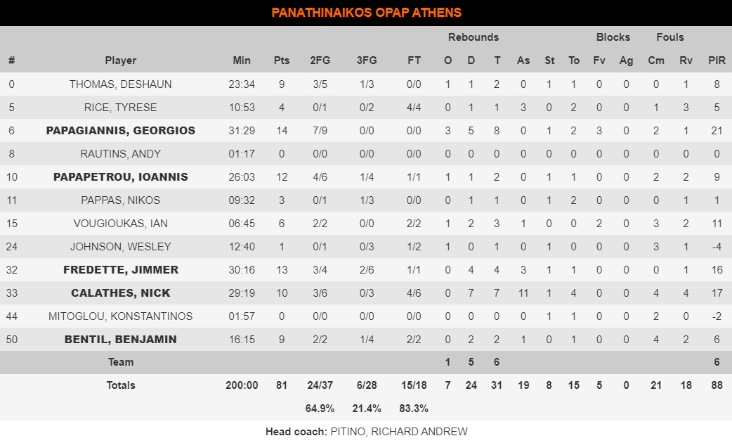 Παναθηναϊκός (Πιτίνο): Τόμας 9, Ράις 4, Παπαγιάννης 14 (8 ριμπ.), Ράουτινς, Παπαπέτρου 12, Παππάς 3, Βουγιούκας 6, Τζόνσον 1, Φριντέτ 13, Καλάθης 10 (11 ασίστ, 7 ριμπ.), Μήτογλου, Μπέντιλ 9