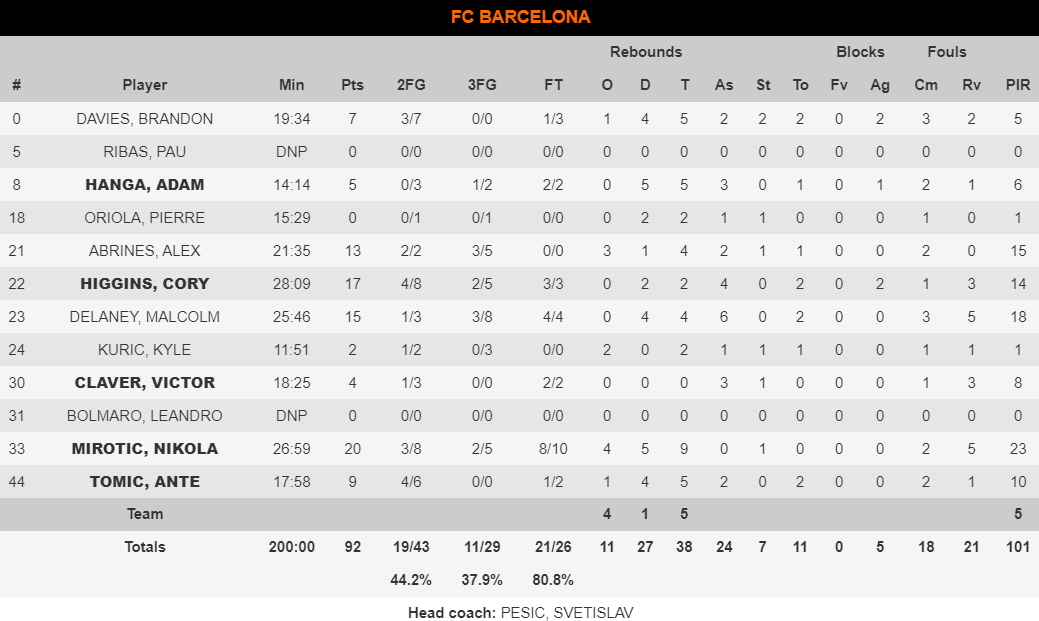 Μπαρτσελόνα (Πέσιτς): Ντέιβις 7, Ρίμπας, Χάνγκα 5, Οριόλα, Αμπρίνες 13, Χίγκινς 17, Ντιλέινι 15 (6 ασίστ), Κούριτς 2, Κλαβέρ 4, Μπολμάρο, Μίροτιτς 20 (9 ριμπ.), Τόμιτς 9