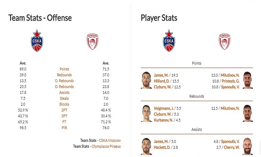Η αποψινή, είναι η 39η αναμέτρηση των δύο ομάδων από το 1995 και έπειτα, οπότε και αγωνίστηκαν για πρώτη φορά σε επίπεδο κυπέλλου πρωταθλητριών και Ευρωλίγκας. Η ΤΣΣΚΑ, προηγείται με 24-14 στις νίκες, έχοντας όμως τέσσερις ήττες σε Final Four (ένας τελικός και τρεις ημιτελικοί). Στα παιχνίδια που έχουν γίνει στη Μόσχα, οι ρώσοι έχουν επικρατήσει 14 φορές και ο Ολυμπιακός μόλις 3, με την τελευταία να είναι το 2008 στα πλέι οφ με το νικητήριο καλάθι του Λιν Γκριρ. Έκτοτε, οι «ερυθρόλευκοι» μετρούν εκτός έδρας επτά συνεχόμενες ήττες.