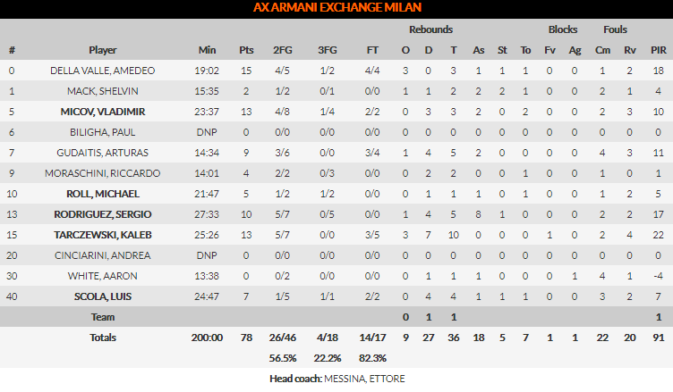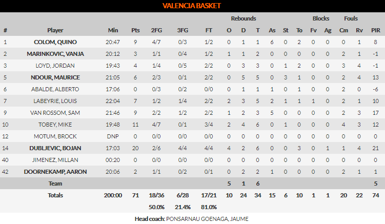 Πρώτος σκόρερ αναδείχθηκε ο Ντούμπλιεβιτς με 20 πόντους, την ώρα που ο Ντε λα Βάλε σημείωσε 15.