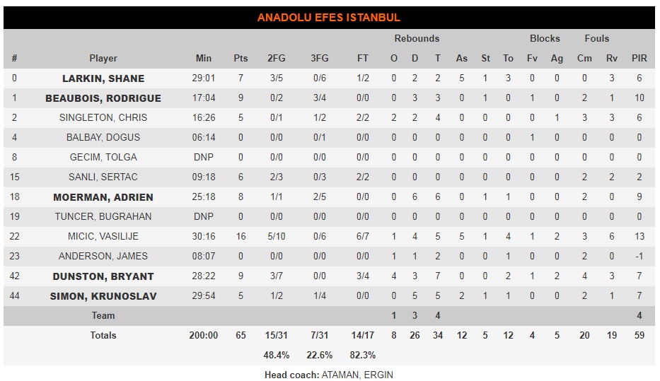 Και οι δύο ομάδες ήταν άστοχες στο πρώτο ημίχρονο έχοντας χαμηλά ποσοστά, με κακές και βιαστικές επιλογές στην επίθεση. Οι παίκτες της Εφές όμως βασιζόμενοι σε κάποιες καλές αμυντικές ενέργειες, κυρίως ατομικές και όχι ομαδικές, είχαν ένα προβάδισμα στο σκορ. Και στο τέλος της πρώτης περιόδου (20-13) αλλά και στο τέλος της δεύτερης (37-31).